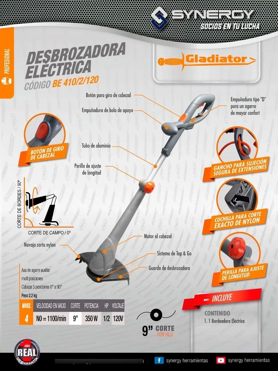 Con sistema de hilo de nylon y cabezal multiposición, permite trabajar cerca de bardas y banquetas sin dañar superficies.
