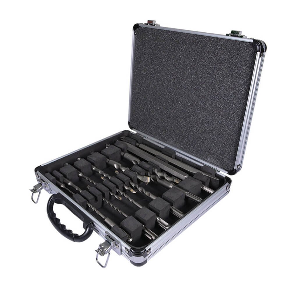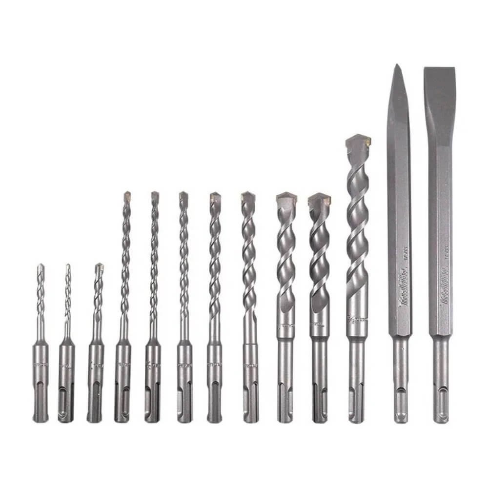 Incluye brocas para concreto en diferentes diámetros y longitudes, además de cinceles para trabajos de demolición ligera. Es un kit pensado para uso profesional en rotomartillo.