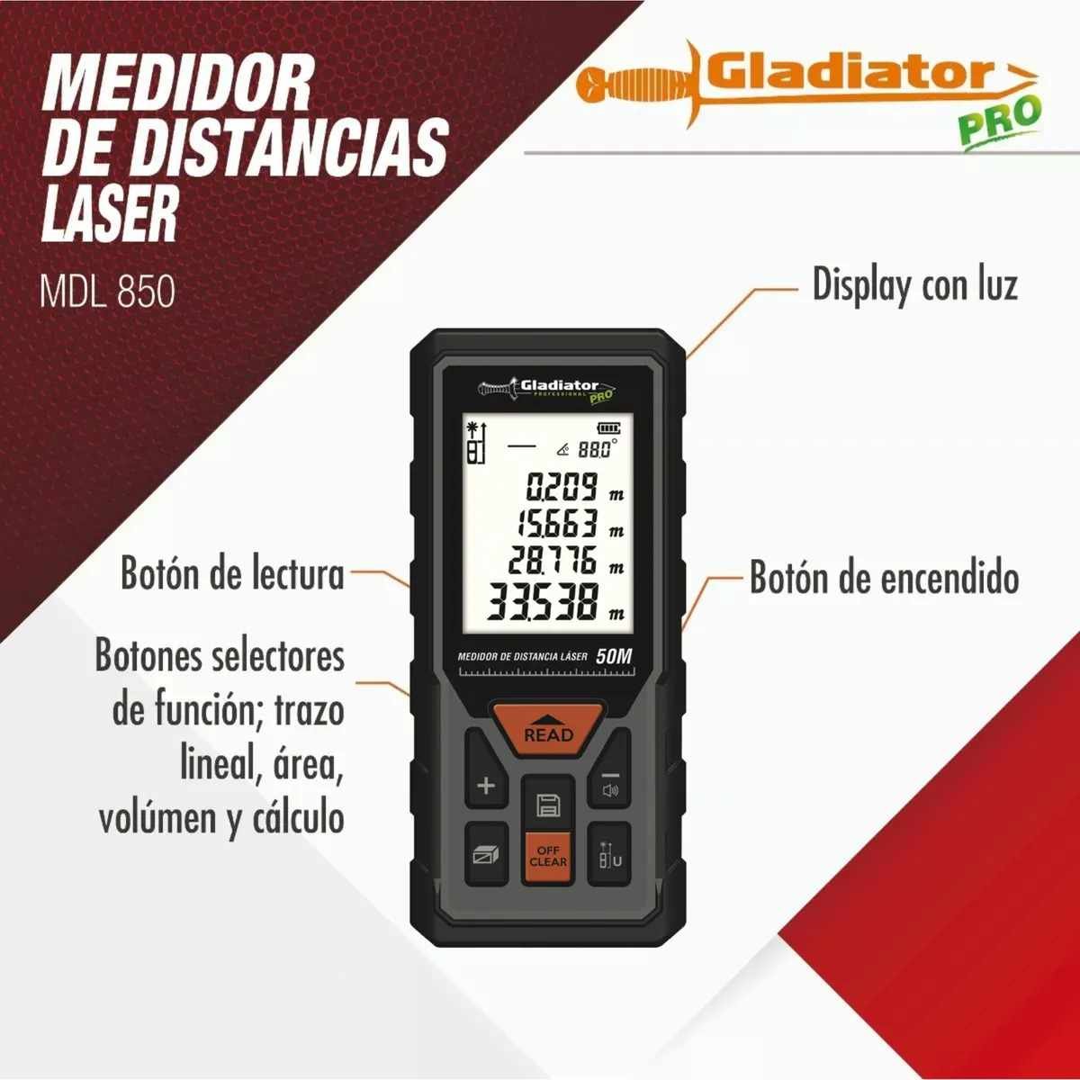 El Medidor Láser Gladiator MDL8500 mide hasta 50 metros con precisión ±2 mm.